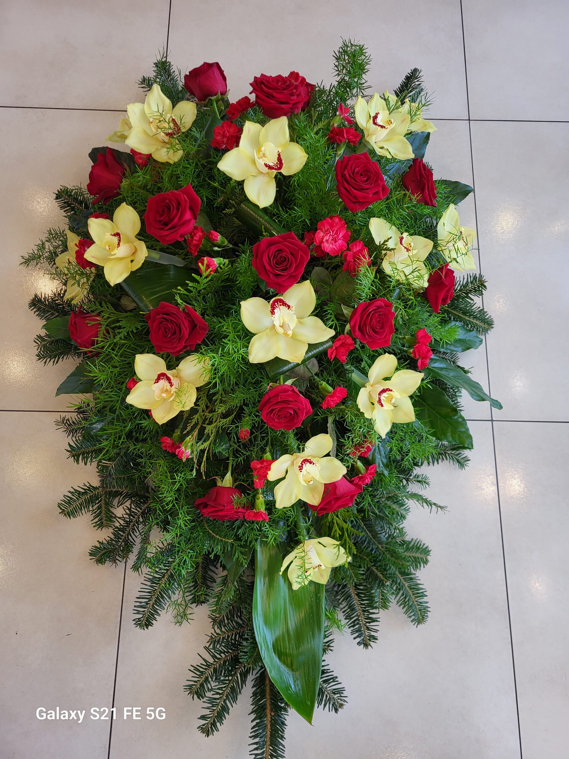 Palma składa się z storczyka cymbidium , róż i mini goździków. Dostępność takiego zestawu kwiatów jest w sezonie zimowo wiosennym. Kolorystykę ustala się po konsultacji telefonicznej z kwiaciarnią. Zdjęcie poglądowe.